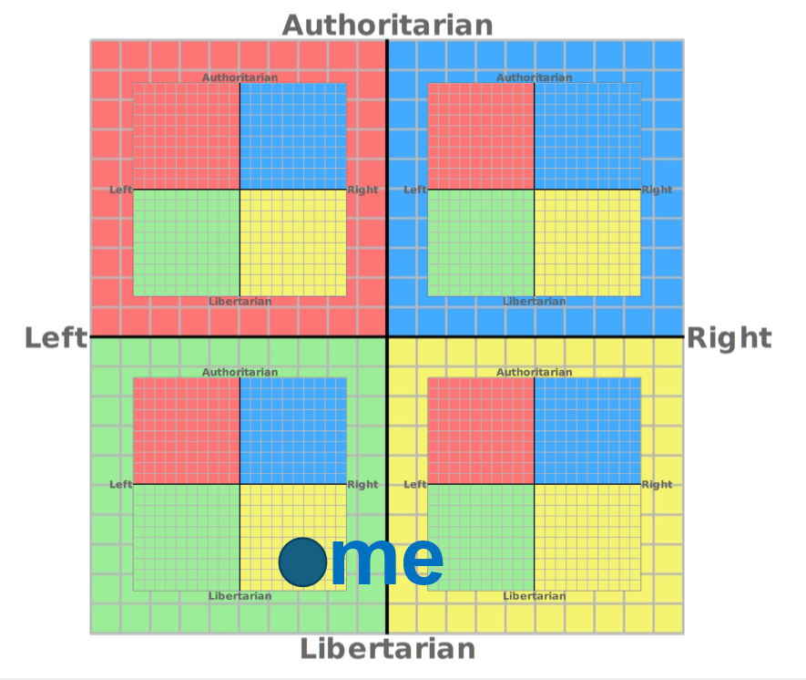 Bežné zobrazenie politického kompasu rozpoznáva iba autoritatívnosť vs libertariánstvo a ľavo-pravosť. Ekonomická os rieši distribúciu zdrojov. Miera slobody definuje spôsob riadenia spoločnosti. Pre komplexnejší obraz možno ešte rozčleniť ľudí kooperujúcich v rámci hodnôt kvartálov podľa špecifickejšej orientácie definujúcej uprednostňovanú...